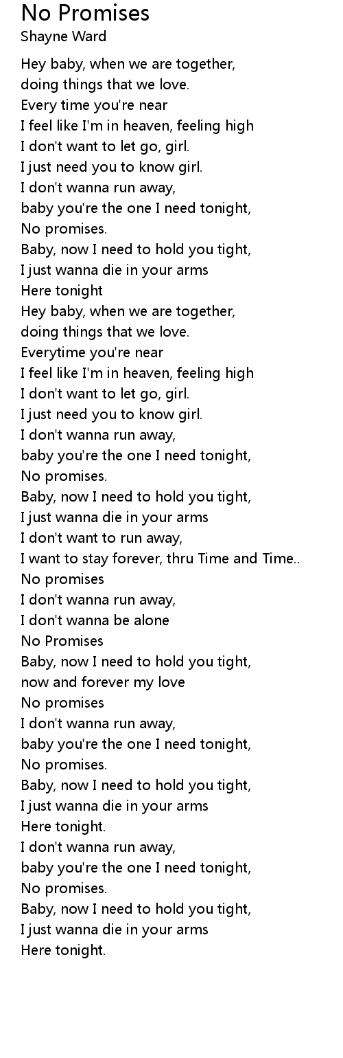 Shayne Ward - No Promises (Lyrics) Stream no promises : - listen no promises shayne ward : - Shayne Ward Facebook: - Twitter: - Instagram: - picture : unsplash no promises lyrics : Hey baby, when we are together Doing things that we love Every time you're near I feel like I'm in heaven Feeling high I don't want to let go, girl I just need you to know, girl I don't wanna run away Baby, you're the one I need tonight No promises Baby, now I need to hold you tight I just wanna die in your arms here tonight Hey baby, when we are together Doing things that we love Every time you're near I feel like I'm in heaven Feeling high I don't want to let go, girl I just need you to know, girl I don't wanna run away Baby, you're the one I need tonight No promises Baby, now I need to hold you tight I just wanna die in your arms I don't wanna run away I want to stay forever through time and time No promises I don't wanna run away I don't wanna be alone No promises Baby, now I need to hold you tight Now and forever, my love No promises I don't wanna run away Baby, you're the one I need tonight No promises Baby, now I need to hold you tight I just wanna die in your arms here tonight I don't wanna run away Baby, you're the one I need tonight No promises Baby, now I need to hold you tight I just wanna die in your arms here tonight